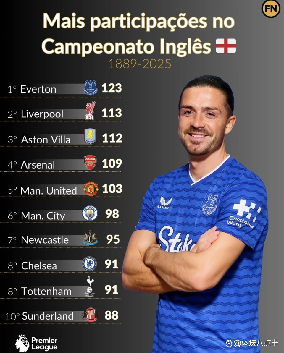 长期在场的意义:埃弗顿虽近两季徘徊保级线,但以123季高居参赛次数第一,领先幅度大,短期内难被追上。