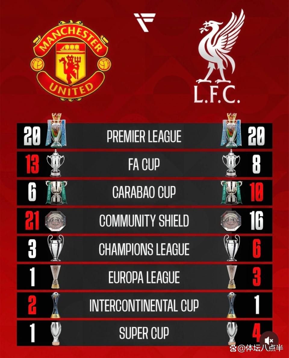 参赛113比103!曼联少10赛季却与利物浦20冠持平 效率差距一目了然